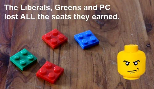 NOTE: Many countries that use PR have a minimum threshold for winning seats. It's usually in the range of 3-5%, which means that, using the exact popular vote that each party received from voters, the Greens and PC wouldn't have won any seats. BUT, under a fair voting system it's likely that the raw numbers would have changed. Without "strategic voting", the smaller parties would have each received a much higher proportion of the vote, and won even more seats than shown here
